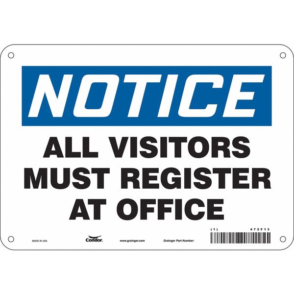Safety Sign, 7 in Height, 10 in Width, Aluminum, Vertical Rectangle, English, 472F13SKU G5217928Categories SafetyDescription Safety Sign, Vertical Rectangle, Number of Printed Sides 1, English, Sign Legend All Visitors Must Register At Office, Sign Legend Background Color White, Sign Legend Style TextgraingerSKU: 472F13, mscSKU: , zoro_no: G5217928, mongo_id: 65bbea5222d7a989a99a880d
