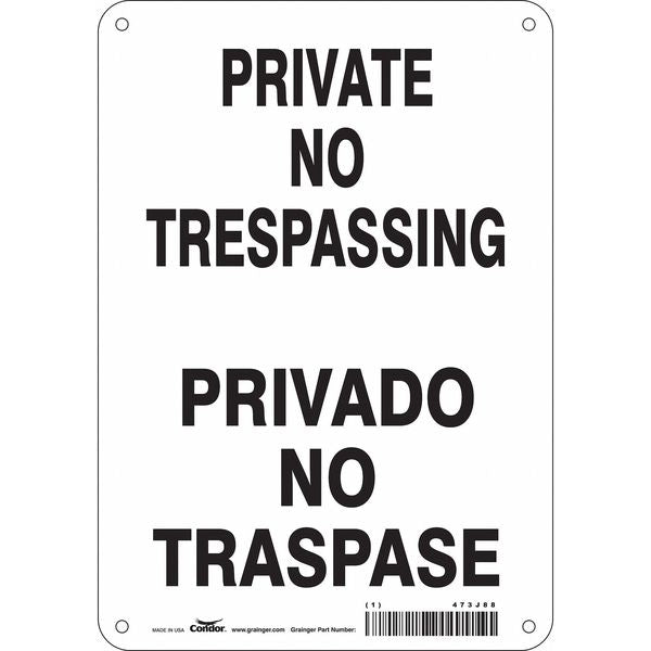 SKU G5617582Categories SafetyDescription Safety Sign, Horizontal Rectangle, Number of Printed Sides 1, English, Spanish, Sign Format Other Format, Sign Legend Private No Trespassing/Privado No Traspase, Sign Legend Background Color White, Sign Legend Style TextgraingerSKU: 473J88, mscSKU: , zoro_no: G5617582, mongo_id: 65bbea5222d7a989a99a8727