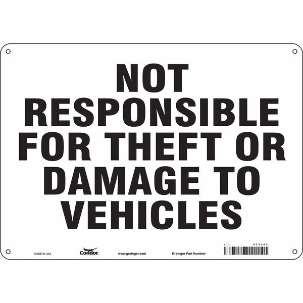 Safety Sign, 10 in Height, 14 in Width, Aluminum, Horizontal Rectangle, English, 473J65SKU G5623392Categories SafetyDescription Safety Sign, Horizontal Rectangle, Number of Printed Sides 1, English, Sign Legend Not Responsible For Theft Or Damage To Vehicles, Sign Legend Background Color White, Sign Legend Style TextgraingerSKU: 473J65, mscSKU: , zoro_no: G5623392, mongo_id: 65bbea5222d7a989a99a8733