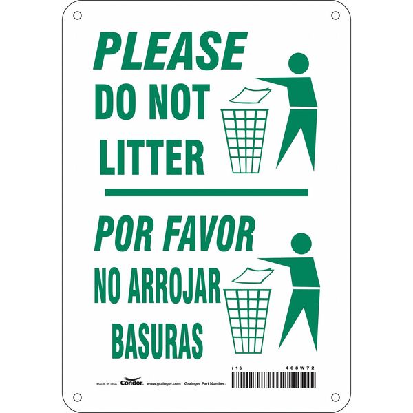 Safety Sign, 10 in Height, 7 in Width, Aluminum, Horizontal Rectangle, English, Spanish, 468W72SKU G5211031Categories SafetyDescription Safety Sign, Horizontal Rectangle, Number of Printed Sides 1, English, Spanish, Sign Format Other Format, Sign Legend Please Do Not Litter Por Favor No Arrojar Basuras, Sign Legend Background Color White, Sign Legend Style Symbol and TextgraingerSKU: 468W72, mscSKU: , zoro_no: G5211031, mongo_id: 65bbea5222d7a989a99a87fe