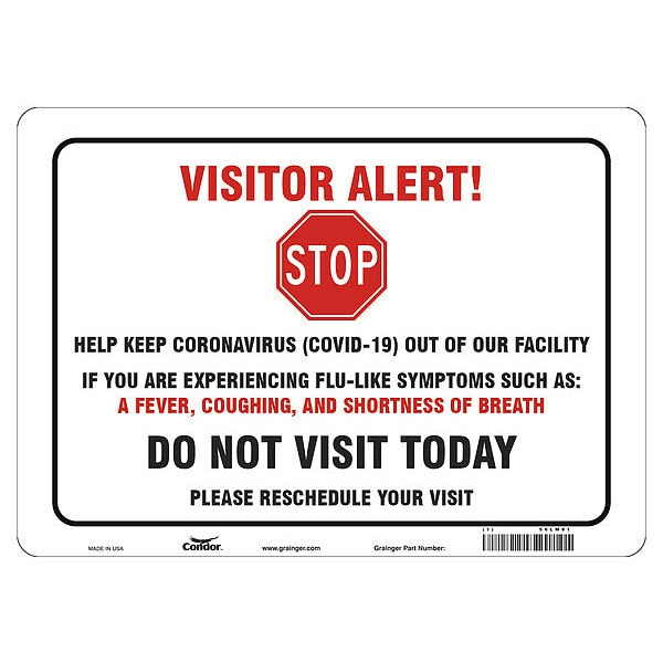 Covid 19 Sign 10X14, Visitor Alert Cv19, , 10 in Height, 14 in Width, Polystyrene, EnglishSKU G7660643Categories SafetyDescription Covid 19 Sign 10X14, Visitor Alert Cv19,, Sign Subject Matter Coronavirus Prevention, Height 10 in, Width 14 in, Sign Material Polystyrene, Sign Mounting Style With Mounting Holes, Header No Header, Legend Visitor Alert Stop Help Keep Coronavirus (Covid-19) Out Of Our Facility If You Are Experiencing Flu Like Symptoms Do Not Visit Today, Printed Language English$10.61 / eachWeb price -