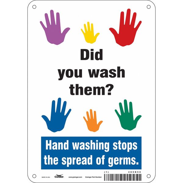 Safety Sign, 10 in Height, 7 in Width, Aluminum, Horizontal Rectangle, English, 485N50SKU G6250820Categories SafetyDescription Safety Sign, Horizontal Rectangle, Number of Printed Sides 1, English, Sign Legend Did You Wash Them? Hand Washing Stops The Spread Of Germs, Sign Legend Background Color Blue, White, Sign Legend Style Symbol and TextgraingerSKU: 485N50, mscSKU: , zoro_no: G6250820, mongo_id: 65bbea5222d7a989a99a864e