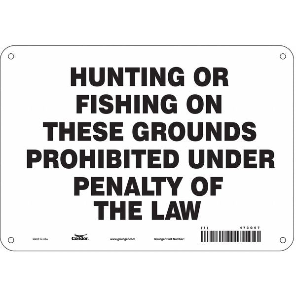 SKU G5587248Categories SafetyDescription Safety Sign, Vertical Rectangle, Number of Printed Sides 1, English, Sign Format Other Format, Sign Legend Hunting Or Fishing On These Grounds Prohibited Under Penalty Of The Law, Sign Legend Background Color White, Sign Legend Style TextgraingerSKU: 473G67, mscSKU: , zoro_no: G5587248, mongo_id: 65bbea5222d7a989a99a85ca