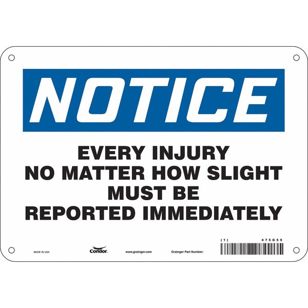 SKU G5829980Categories SafetyDescription Safety Sign, Vertical Rectangle, Number of Printed Sides 1, English, Sign Format Traditional OSHA, Sign Legend Every Injury No Matter How Slight Must Be Reported Immediately, Sign Legend Background Color White, Sign Legend Style TextgraingerSKU: 475G59, mscSKU: , zoro_no: G5829980, mongo_id: 65bbea5222d7a989a99a8611