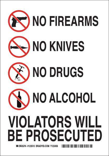 SKU G7374591Categories SafetyDescription Admittance Sign, Sign Subject Matter Weapons, Devices or Substances, Height 14 in, Width 10 in, Sign Material Polyester, Sign Mounting Style Adhesive Surface, Header No Header, Legend No Firearms No Knives No Drugs No Alcohol Violators Will Be Prosecuted, Printed Language English, Sign Shape Rectangle$16.99 / eachWeb priceAdmittance Sign, 14X10", Blk and Rd/Wht, Height: 14"SKU G7374591Categories SafetyDescription Admittance Sign, Sign Subject Matter Weapons, Devices or Substances, Height 14 in, Width 10 in, Sign Material Polyester, Sign Mounting Style Adhesive Surface, Header No Header, Legend No Firearms No Knives No Drugs No Alcohol Violators Will Be Prosecuted, Printed Language English, Sign Shape Rectangle$16.99 / eachWeb price -