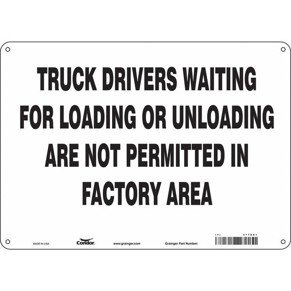 SKU G5772818Categories SafetyDescription Safety Sign, Horizontal Rectangle, Number of Printed Sides 1, English, Sign Format Other Format, Sign Legend Truck Drivers Waiting For Loading Or Unloading Are Not Permitted In Factory Area, Sign Legend Background Color White, Sign Legend Style TextgraingerSKU: 477D61, mscSKU: , zoro_no: G5772818, mongo_id: 65bbe83422d7a989a98df9c7