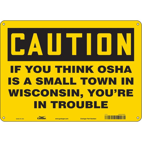 $25.19 / eachWeb priceSafety Sign, 10 in Height, 14 in Width, Aluminum, Horizontal Rectangle, English, 486P85SKU G6266500Categories SafetyDescription Safety Sign, Horizontal Rectangle, Number of Printed Sides 1, English, Sign Legend If You Think Osha Is A Small Town In Wisconsin, You'Re In Trouble, Sign Legend Background Color Yellow, Sign Legend Style TextgraingerSKU: 486P85, mscSKU: , zoro_no: G6266500, mongo_id: 65bbe83422d7a989a98df91d