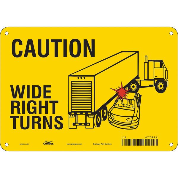 $18.74 / eachWeb priceTraffic Sign, 7 in H, 10 in W, Aluminum, Vertical Rectangle, English, 477R34SKU G5875578Categories SafetyDescription Traffic Sign, Vertical Rectangle, Number of Printed Sides 1, English, Sign Format Other Format, Sign Legend Caution Wide Right Turns, Sign Legend Background Color Yellow, Sign Legend Style Symbol and TextgraingerSKU: 477R34, mscSKU: , zoro_no: G5875578, mongo_id: 65bbe83422d7a989a98df99a