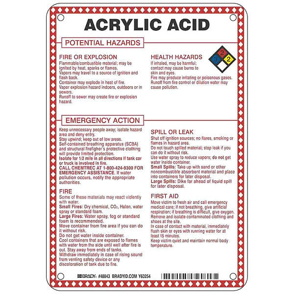 SKU G5575981Categories SafetyDescription Chemical Sign, Acrylic Acid Potential Hazards, Fiberglass, Height 10 in, Width 7 in, Header No Header, Legend Style Symbol and Text, Language English, Mounting Style Surface, Thickness 0.1 in, Sign Shape Rectangle, Operating Temp. Range -40 Degrees to 194 Degrees F, Retroreflective Grade Not RetroreflectivegraingerSKU: 41F455, mscSKU: , zoro_no: G5575981, mongo_id: 65bbe9c522d7a989a9977bb0