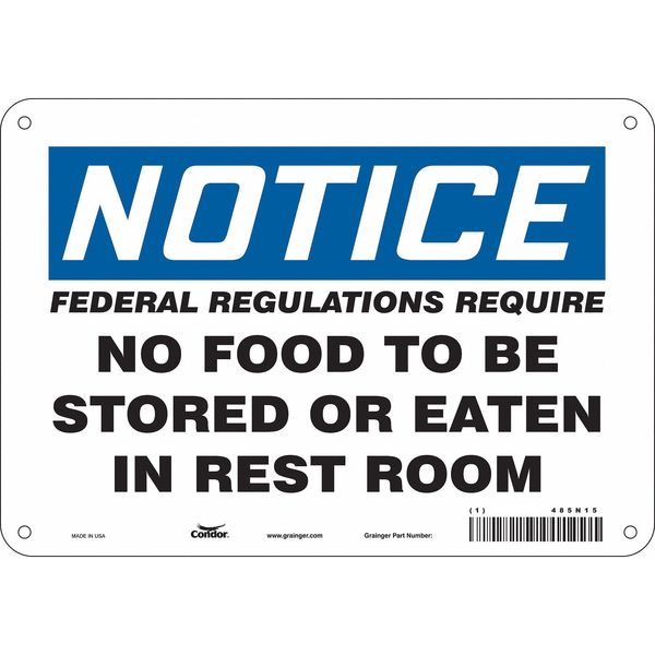Safety Sign, 7 in Height, 10 in Width, Aluminum, Vertical Rectangle, English, 485N15SKU G6271863Categories SafetyDescription Safety Sign, Vertical Rectangle, Number of Printed Sides 1, English, Sign Legend Federal Regulations Require No Food To Be Stored Or Eaten In Rest Room, Sign Legend Background Color White, Sign Legend Style TextgraingerSKU: 485N15, mscSKU: , zoro_no: G6271863, mongo_id: 65bbe98f22d7a989a9960c81