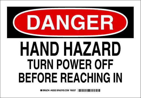 SKU G8463688Categories SafetyDescription Danger Sign, Sign Subject Matter Electrical Hazard, Height 10 in, Width 14 in, Sign Material Aluminum, Sign Mounting Style With Mounting Holes, Header Danger, Legend Hand Hazard Turn Power Off Before Reaching In, Printed Language English, Sign Shape Rectangle$32.11 / eachWeb priceDanger Sign, 10 in Height, 14 in Width, Aluminum, Rectangle, EnglishSKU G8463688Categories SafetyDescription Danger Sign, Sign Subject Matter Electrical Hazard, Height 10 in, Width 14 in, Sign Material Aluminum, Sign Mounting Style With Mounting Holes, Header Danger, Legend Hand Hazard Turn Power Off Before Reaching In, Printed Language English, Sign Shape Rectangle$32.11 / eachWeb price