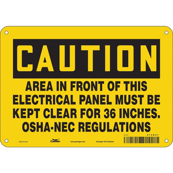 Safety Sign, 7 in Height, 10 in Width, Aluminum, Vertical Rectangle, English, 475N01SKU G5122579Categories SafetyDescription Safety Sign, Vertical Rectangle, Number of Printed Sides 1, English, Sign Format Traditional OSHA, Sign Legend Area In Front Of This Electrical Panel Must Be Kept Clear For 36 Inches Osha-Nec Regulations, Sign Legend Background Color Yellow, Sign Legend Style TextgraingerSKU: 475N01, mscSKU: , zoro_no: G5122579, mongo_id: 65bbe9fd22d7a989a998bc04