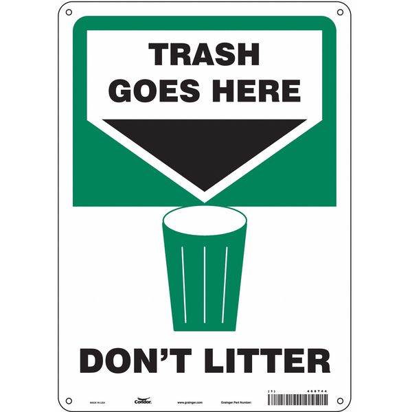 SKU G5602873Categories SafetyDescription Safety Sign, Vertical Rectangle, Number of Printed Sides 1, English, Sign Legend Trash Goes Here Don't Litter, Sign Legend Background Color Green, White, Sign Legend Style Symbol and TextgraingerSKU: 468T44, mscSKU: , zoro_no: G5602873, mongo_id: 65bbe9fd22d7a989a998bc71