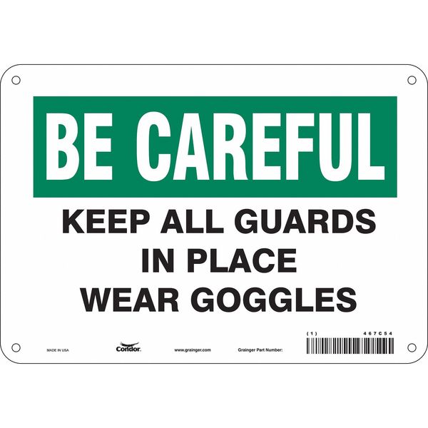 Safety Sign, 7 in Height, 10 in Width, Aluminum, Vertical Rectangle, English, 467C54SKU G5203919Categories SafetyDescription Safety Sign, Vertical Rectangle, Number of Printed Sides 1, English, Sign Format Other Format, Sign Legend Be Careful Keep All Guards In Place Wear Goggles, Sign Legend Background Color Green, White, Sign Legend Style TextgraingerSKU: 467C54, mscSKU: , zoro_no: G5203919, mongo_id: 65bbe9fd22d7a989a998bc12