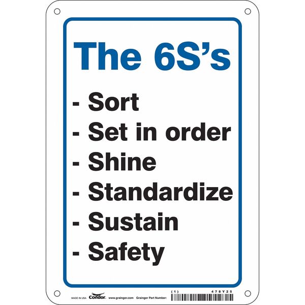 Safety Sign, 10 in Height, 7 in Width, Aluminum, Horizontal Rectangle, English, 478Y25SKU G5888887Categories SafetyDescription Safety Sign, Horizontal Rectangle, Number of Printed Sides 1, English, Sign Format Other Format, Sign Legend The 6S'S -Sort -Set In Order -Shine -Standardize -Sustain -Safety, Sign Legend Background Color White, Sign Legend Style TextgraingerSKU: 478Y25, mscSKU: , zoro_no: G5888887, mongo_id: 65bbe9d322d7a989a997d873