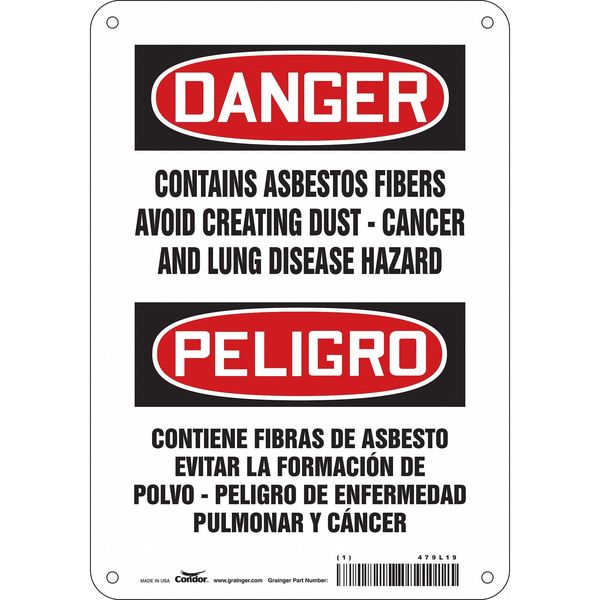 Safety Sign, 10 in Height, 7 in Width, Aluminum, Horizontal Rectangle, English, Spanish, 479L19SKU G5866679Categories SafetyDescription Safety Sign, Horizontal Rectangle, Number of Printed Sides 1, English, Spanish, Sign Format Traditional OSHA, Sign Legend Contains Asbestos Fibers Avoid Creating Dust - Cancer And Lung Disease Hazard/Contiene Fibras De Asbesto Evitar La Formacion De Polvo - Peligro De Enfermedad Pulmonar Y Cancer, Sign Legend Background Color White, Sign Legend Style TextgraingerSKU: 479L19, mscSKU: , zoro_no: G5866679, mongo_id: 65bbe9d322d7a989a997d82f