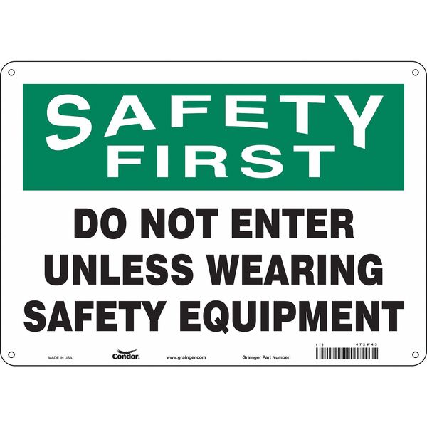 Safety Sign, 10 in Height, 14 in Width, Aluminum, Horizontal Rectangle, English, 472W43SKU G5208819Categories SafetyDescription Safety Sign, Horizontal Rectangle, Number of Printed Sides 1, English, Sign Format Traditional OSHA, Sign Legend Do Not Enter Unless Wearing Safety Equipment, Sign Legend Background Color White, Sign Legend Style TextgraingerSKU: 472W43, mscSKU: , zoro_no: G5208819, mongo_id: 65bbe9d322d7a989a997d759