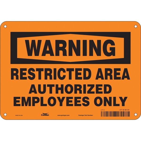 Safety Sign, 7 in Height, 10 in Width, Aluminum, Vertical Rectangle, English, 472G55SKU G5831353Categories SafetyDescription Safety Sign, Vertical Rectangle, Number of Printed Sides 1, English, Sign Format Traditional OSHA, Sign Legend Restricted Area Authorized Employees Only, Sign Legend Background Color Orange, Sign Legend Style TextgraingerSKU: 472G55, mscSKU: , zoro_no: G5831353, mongo_id: 65bbe9d322d7a989a997d72b
