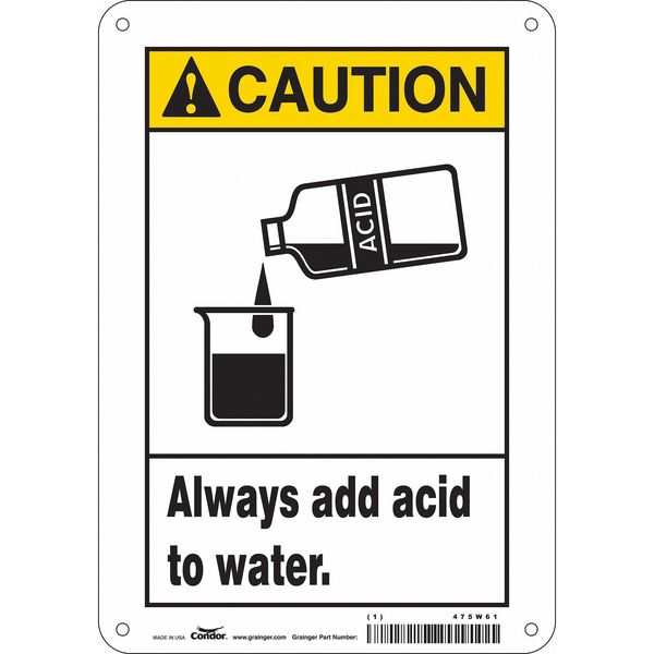 Safety Sign, 10 in Height, 7 in Width, Aluminum, Horizontal Rectangle, English, 475W61SKU G5791392Categories SafetyDescription Safety Sign, Horizontal Rectangle, Number of Printed Sides 1, English, Sign Format ANSI/OSHA Format, Sign Legend Always Add Acid To Water., Sign Legend Background Color White, Sign Legend Style Symbol and TextgraingerSKU: 475W61, mscSKU: , zoro_no: G5791392, mongo_id: 65bbe9d322d7a989a997d70c