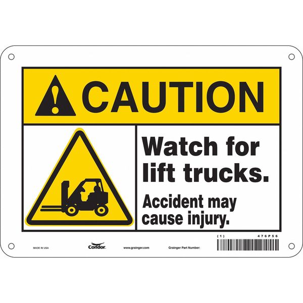 Safety Sign, 7 in Height, 10 in Width, Aluminum, Vertical Rectangle, English, 476P56SKU G5780393Categories SafetyDescription Safety Sign, Vertical Rectangle, Number of Printed Sides 1, English, Sign Format ANSI/OSHA Format, Sign Legend Watch For Lift Trucks. Accident May Cause Injury., Sign Legend Background Color White, Sign Legend Style Symbol and TextgraingerSKU: 476P56, mscSKU: , zoro_no: G5780393, mongo_id: 65bbe9d322d7a989a997d708