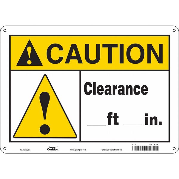Safety Sign, 10 in Height, 14 in Width, Aluminum, Horizontal Rectangle, English, 477L50SKU G5848433Categories SafetyDescription Safety Sign, Horizontal Rectangle, Number of Printed Sides 1, English, Sign Format ANSI/OSHA Format, Sign Legend Clearance ___ Ft ___ In., Sign Legend Background Color White, Sign Legend Style Symbol and TextgraingerSKU: 477L50, mscSKU: , zoro_no: G5848433, mongo_id: 65bbe9d322d7a989a997d6d3