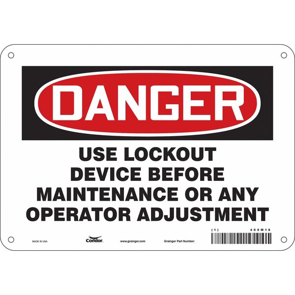 Safety Sign, 7 in Height, 10 in Width, Aluminum, Vertical Rectangle, English, 469M18SKU G5206299Categories SafetyDescription Safety Sign, Vertical Rectangle, Number of Printed Sides 1, English, Sign Format Traditional OSHA, Sign Legend Use Lockout Device Before Maintenance Or Any Operator Adjustment, Sign Legend Background Color White, Sign Legend Style TextgraingerSKU: 469M18, mscSKU: , zoro_no: G5206299, mongo_id: 65bbea2822d7a989a999a2b1
