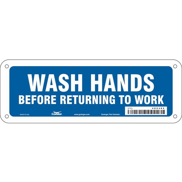SKU G6300712Categories SafetyDescription Safety Sign, Vertical Rectangle, Number of Printed Sides 1, English, Sign Format Other Format, Sign Legend Wash Hands Before Returning To Work, Sign Legend Background Color Blue, White, Sign Legend Style TextgraingerSKU: 485J62, mscSKU: , zoro_no: G6300712, mongo_id: 65bbea2822d7a989a999a2e9