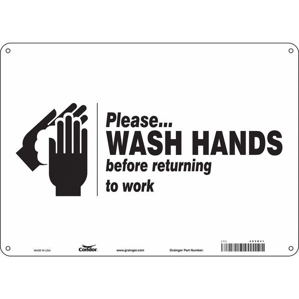 SKU G6267803Categories SafetyDescription Safety Sign, Horizontal Rectangle, Number of Printed Sides 1, English, Sign Format Other Format, Sign Legend Please Wash Hands Before Returning To Work, Sign Legend Background Color White, Sign Legend Style Symbol and TextgraingerSKU: 485N41, mscSKU: , zoro_no: G6267803, mongo_id: 65bbea2822d7a989a999a0fa