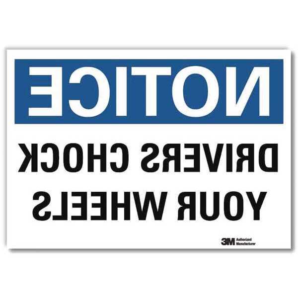 Notice Sign, 7 in H, 10 in W, Reflective Sheeting, Vertical Rectangle, English, U5-1156-RD_10X7SKU G2763470Categories SafetyDescription Notice Sign, Vertical Rectangle, Number of Printed Sides 1, English, Sign Format Traditional OSHA, Sign Legend Drivers Chock Your Wheels (Mirrored Image), Sign Legend Background Color White, Sign Legend Style TextgraingerSKU: 34JK95, mscSKU: , zoro_no: G2763470, mongo_id: 65bbea2822d7a989a9999c8e