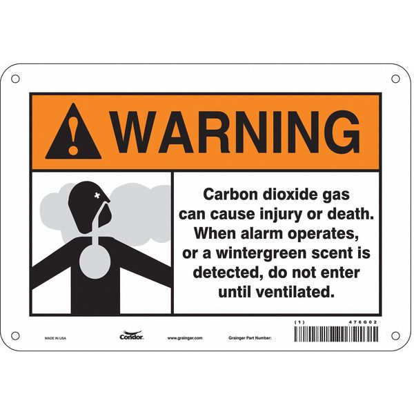 SKU G5831073Categories SafetyDescription Chemical Sign, Vertical Rectangle, Number of Printed Sides 1, English, Sign Format ANSI/OSHA Format, Sign Legend Carbon Dioxide Gas Can Cause Injury Or Death. When Alarm Operates, Or A Wintergreen Scent Is Detected, Do Not Enter Until Ventilated., Sign Legend Background Color White, Sign Legend Style Symbol and TextgraingerSKU: 476G02, mscSKU: , zoro_no: G5831073, mongo_id: 65bbe9ad22d7a989a996f355