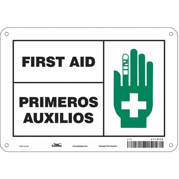 First Aid Sign, 10" W x 7" H, 0.032" Thick, 471R90SKU G5560383Categories SafetyDescription First Aid Sign, Vertical Rectangle, Number of Printed Sides 1, English, Spanish, Sign Legend First Aid/Primeros Auxilios, Sign Legend Background Color White, Sign Legend Style Symbol and TextgraingerSKU: 471R90, mscSKU: , zoro_no: G5560383, mongo_id: 65bbe9ad22d7a989a996f2f4