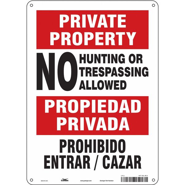 Safety Sign, 14 in Height, 10 in Width, Aluminum, Vertical Rectangle, English, Spanish, 473L93SKU G5621222Categories SafetyDescription Safety Sign, Vertical Rectangle, Number of Printed Sides 1, English, Spanish, Sign Format Other Format, Sign Legend No Hunting Or Trespassing Allowed/Propiedad Privada Prohibido Entrar/Cazar, Sign Legend Background Color Red, White, Sign Legend Style TextgraingerSKU: 473L93, mscSKU: , zoro_no: G5621222, mongo_id: 65bbe9ad22d7a989a996f22c