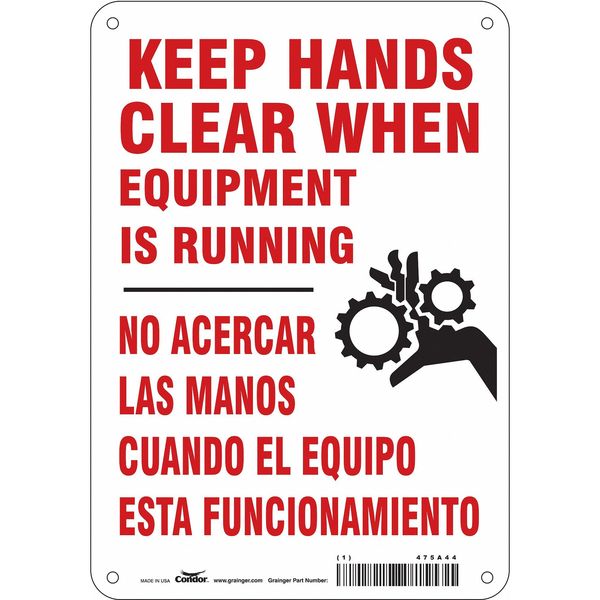 Safety Sign, 10 in Height, 7 in Width, Aluminum, Horizontal Rectangle, English, Spanish, 475A44SKU G5129247Categories SafetyDescription Safety Sign, Horizontal Rectangle, Number of Printed Sides 1, English, Spanish, Sign Format Other Format, Sign Legend Keep Hands Clear When Equipment Is Running/No Acercar Las Manos Cuando El Equipo Esta Funcionamiento, Sign Legend Background Color White, Sign Legend Style Symbol and TextgraingerSKU: 475A44, mscSKU: , zoro_no: G5129247, mongo_id: 65bbe9ad22d7a989a996f3b7