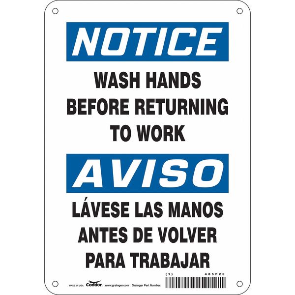 Safety Sign, 10 in Height, 7 in Width, Aluminum, Horizontal Rectangle, English, Spanish, 485P20SKU G6250443Categories SafetyDescription Safety Sign, Horizontal Rectangle, Number of Printed Sides 1, English, Spanish, Sign Format Traditional OSHA, Sign Legend Wash Hands Before Returning To Work/Lavese Las Manos Antes De Volver Para Trabajar, Sign Legend Background Color White, Sign Legend Style TextgraingerSKU: 485P20, mscSKU: , zoro_no: G6250443, mongo_id: 65bbe9ad22d7a989a996f131