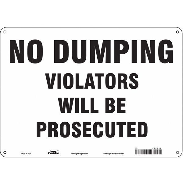Safety Sign, 10 in Height, 14 in Width, Aluminum, Horizontal Rectangle, English, 468T62SKU G5131338Categories SafetyDescription Safety Sign, Horizontal Rectangle, Number of Printed Sides 1, English, Sign Legend No Dumping Violators Will Be Prosecuted, Sign Legend Background Color White, Sign Legend Style TextgraingerSKU: 468T62, mscSKU: , zoro_no: G5131338, mongo_id: 65bbe98822d7a989a9960a5c