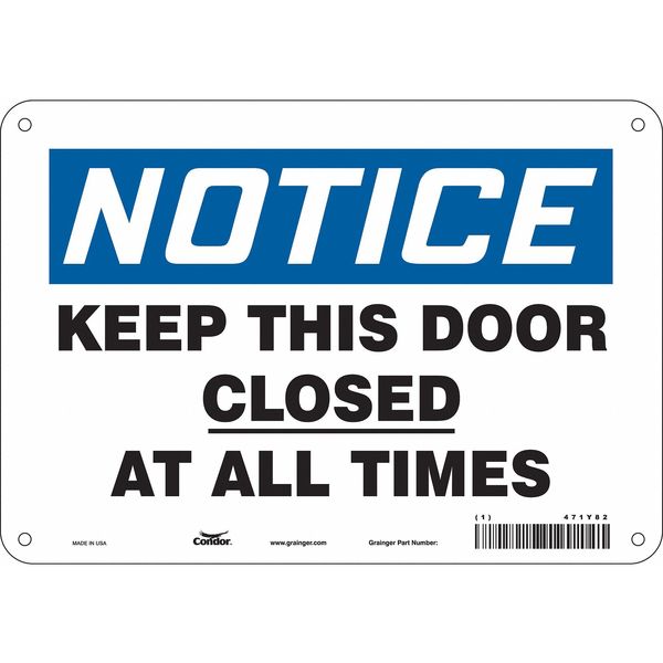 SKU G5094168Categories SafetyDescription Safety Sign, Vertical Rectangle, Number of Printed Sides 1, English, Sign Legend Keep This Door Closed At All Times, Sign Legend Background Color White, Sign Legend Style TextgraingerSKU: 471Y82, mscSKU: , zoro_no: G5094168, mongo_id: 65bbe98822d7a989a9960a81