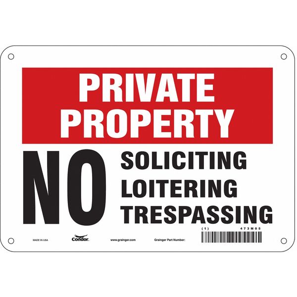 Safety Sign, 7 in Height, 10 in Width, Aluminum, Vertical Rectangle, English, 473M05SKU G5624250Categories SafetyDescription Safety Sign, Vertical Rectangle, Number of Printed Sides 1, English, Sign Format Other Format, Sign Legend No Soliciting Loitering Trespassing, Sign Legend Background Color Red, White, Sign Legend Style TextgraingerSKU: 473M05, mscSKU: , zoro_no: G5624250, mongo_id: 65bbe98822d7a989a9960a4c