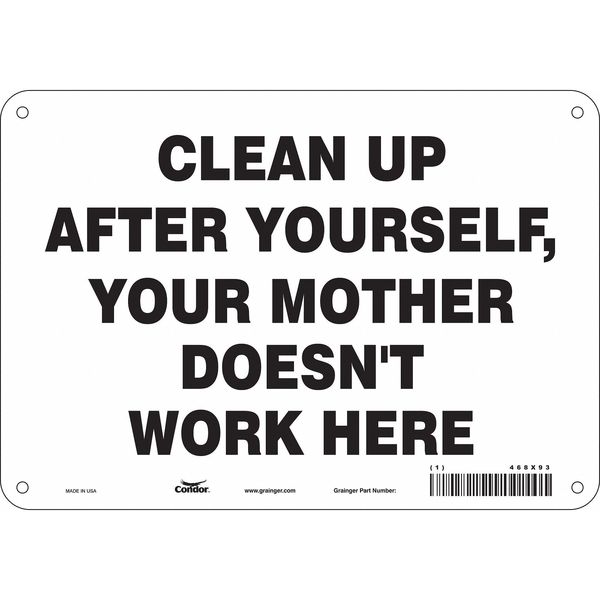 Safety Sign, 7 in Height, 10 in Width, Aluminum, Vertical Rectangle, English, 468X93SKU G5199192Categories SafetyDescription Safety Sign, Vertical Rectangle, Number of Printed Sides 1, English, Sign Format Other Format, Sign Legend Clean Up After Yourself, Your Mother Doesn't Work Here, Sign Legend Background Color White, Sign Legend Style TextgraingerSKU: 468X93, mscSKU: , zoro_no: G5199192, mongo_id: 65bbe98822d7a989a9960c0b
