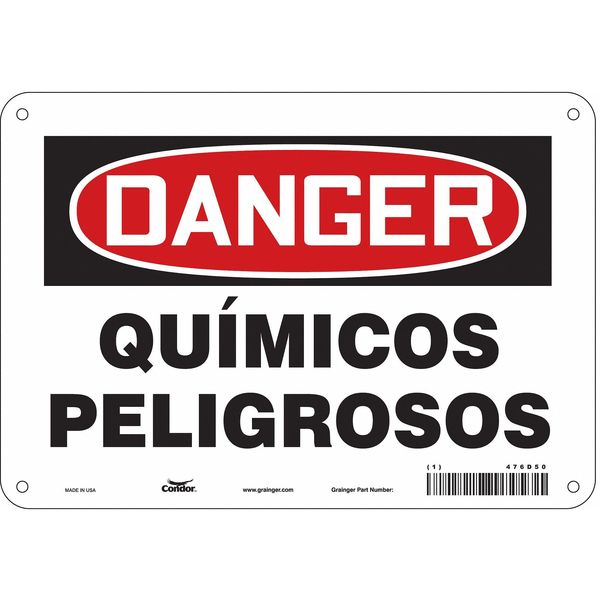 Chemical Sign, 10"W, 7" H, 0.032" ThicknessSKU G5810487Categories SafetyDescription Safety Sign, Vertical Rectangle, Number of Printed Sides 1, Spanish, Sign Format Traditional OSHA, Sign Legend Quimicos Peligrosos, Sign Legend Background Color White, Sign Legend Style TextgraingerSKU: 476D50, mscSKU: , zoro_no: G5810487, mongo_id: 65bbe98822d7a989a9960b9e