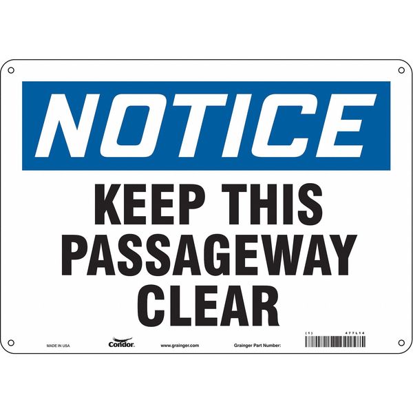 Safety Sign, 10 in Height, 14 in Width, Aluminum, Horizontal Rectangle, English, 477L14SKU G5796968Categories SafetyDescription Safety Sign, Horizontal Rectangle, Number of Printed Sides 1, English, Sign Legend Keep This Passageway Clear, Sign Legend Background Color White, Sign Legend Style TextgraingerSKU: 477L14, mscSKU: , zoro_no: G5796968, mongo_id: 65bbe98822d7a989a9960a2b