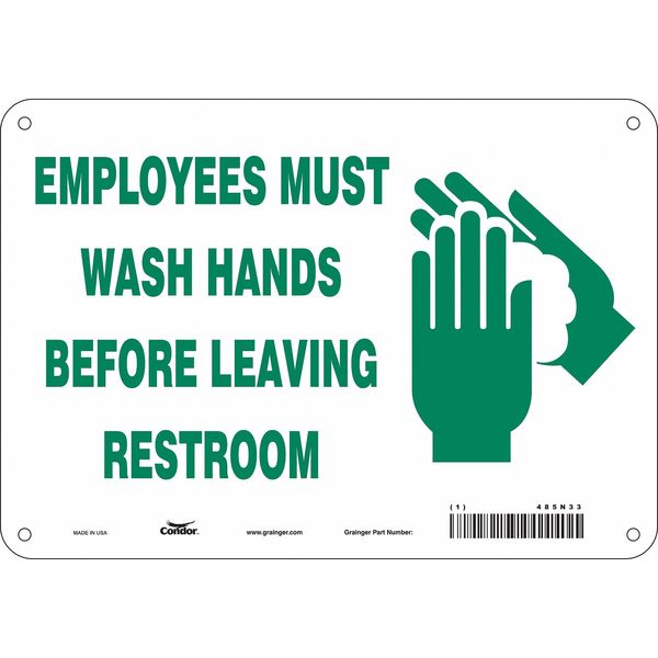Safety Sign, 7 in Height, 10 in Width, Aluminum, Vertical Rectangle, English, 485N33SKU G6301281Categories SafetyDescription Safety Sign, Vertical Rectangle, Number of Printed Sides 1, English, Sign Legend Employees Must Wash Hands Before Leaving Restroom, Sign Legend Background Color White, Sign Legend Style Symbol and TextgraingerSKU: 485N33, mscSKU: , zoro_no: G6301281, mongo_id: 65bbe98822d7a989a9960a93