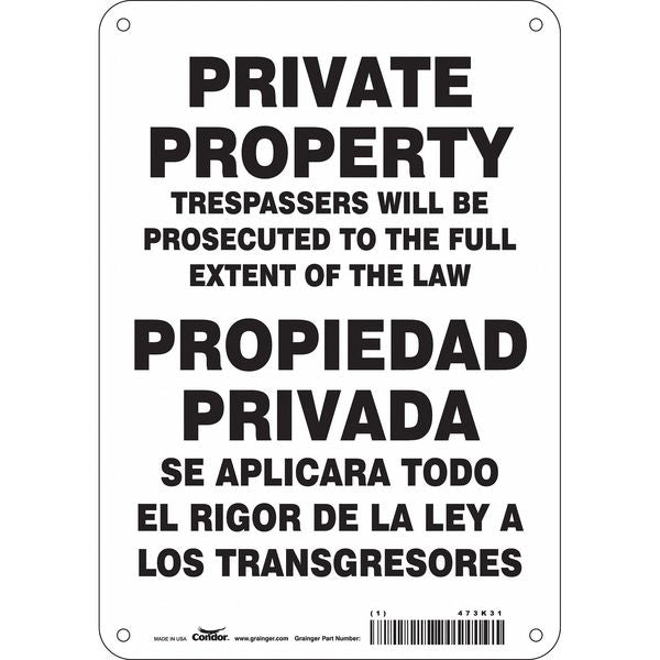 Safety Sign, 10 in Height, 7 in Width, Aluminum, Horizontal Rectangle, English, Spanish, 473K31SKU G5564717Categories SafetyDescription Safety Sign, Horizontal Rectangle, Number of Printed Sides 1, English, Spanish, Sign Format Other Format, Sign Legend Private Property Trespassers Will Be Prosecuted To The Full Extent Of The Law/Propiedad Privada Se Aplicara Todo El Rigor De La Ley A Los Transgresores, Sign Legend Background Color White, Sign Legend Style TextgraingerSKU: 473K31, mscSKU: , zoro_no: G5564717, mongo_id: 65bbe98822d7a989a9960c10