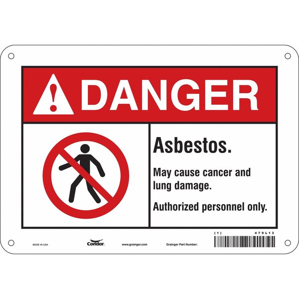 SKU G5782347Categories SafetyDescription Safety Sign, Vertical Rectangle, Number of Printed Sides 1, English, Sign Format ANSI/OSHA Format, Sign Legend Asbestos. May Cause Cancer And Lung Damage. Authorized Personnel Only., Sign Legend Background Color White, Sign Legend Style Symbol and TextgraingerSKU: 479L13, mscSKU: , zoro_no: G5782347, mongo_id: 65bbe98822d7a989a9960b46