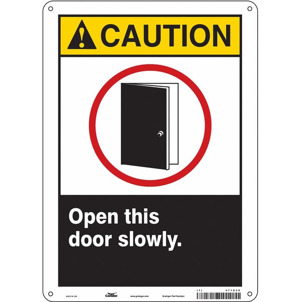 Safety Sign, 14 in Height, 10 in Width, Aluminum, Vertical Rectangle, English, 471X38SKU G5561083Categories SafetyDescription Safety Sign, Vertical Rectangle, Number of Printed Sides 1, English, Sign Format ANSI/OSHA Format, Sign Legend Open This Door Slowly., Sign Legend Background Color Black, White, Sign Legend Style Symbol and TextgraingerSKU: 471X38, mscSKU: , zoro_no: G5561083, mongo_id: 65bbe98822d7a989a9960b60