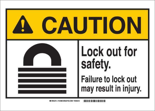 SKU G8465788Categories SafetyDescription Caution Sign, Sign Subject Matter Lockout Tagout, Height 10 in, Width 14 in, Sign Material Aluminum, Sign Mounting Style With Mounting Holes, Header Caution, Legend Lock Out For Safety. Failure To Lock Out May Result In Injury, Printed Language English, Sign Shape Rectangle$32.11 / eachWeb priceCaution Sign, 10 in Height, 14 in Width, Aluminum, Rectangle, EnglishSKU G8465788Categories SafetyDescription Caution Sign, Sign Subject Matter Lockout Tagout, Height 10 in, Width 14 in, Sign Material Aluminum, Sign Mounting Style With Mounting Holes, Header Caution, Legend Lock Out For Safety. Failure To Lock Out May Result In Injury, Printed Language English, Sign Shape Rectangle$32.11 / eachWeb price -
