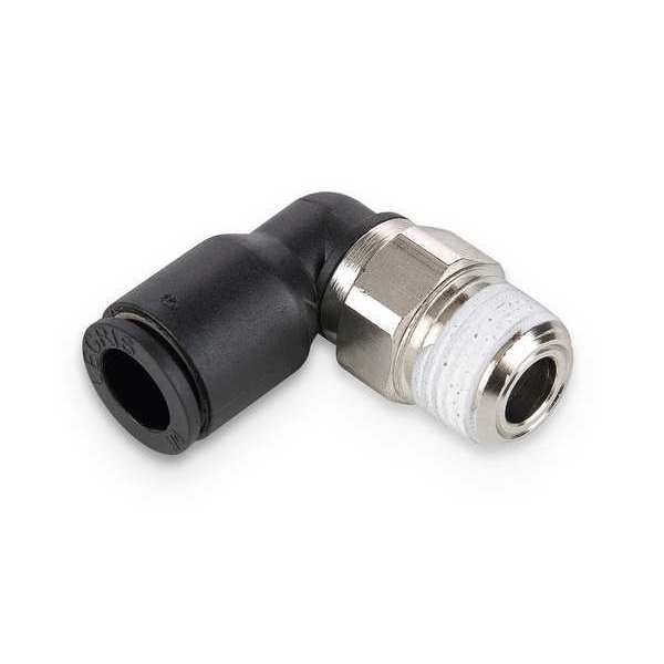 Description Metric Push-to-Connect Fitting, Application Air, Fitting Side A Connection Type BSPT, Fitting Side B Connection Type Push-to-Connect, Fitting Side A Pipe Size 1/8 mm, Fitting Side B Tube Outer Diameter 6 mm, Fitting Material Polymer, Fitting Thread Size R1/8, Color Black, Includes Pre-Applied Thread Sealant Yes, Maximum Operating Pressure 20 barg, Maximum Operating Temperature 176 Degrees F, Overall Length 22 1/2 mm, Specific Fitting Shape 90 Degrees Elbow Adapter, Release Type Ring