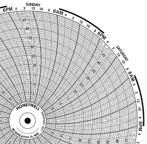 SKU G2989883CategoriesDescription Circular Paper Chart, Chart Size 10.313 In, Range 0 to 50, Recording Time 7 Day, For Use With Honeywell Recorders, Package Quantity 100graingerSKU: 5MEJ8, mscSKU: , zoro_no: G2989883, mongo_id: 65bbe65f3aaddbd5a9026896
