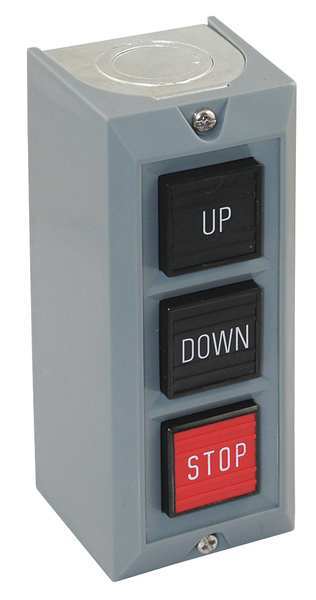 $146.24 / eachWeb pricePush Button Control Station, Up/Down/StopSKU G7501261CategoriesDescription Push Button Control Station, Number of Operators 3, Size 25 mm, Legend Up/Down/Stop, Type of Operator Push Button/Push Button/Push Button, Action Momentary / Momentary / Momentary, Operator Color Black/Black/Red, Contact Form 1NC, 2NO/2NC, Mechanical Interlock No, NEMA Rating 1, Contact Rating 10A @ 600V AC, 5A @ 24V DC, NEMA Contact Rating Designation A600/P600, IP Rating 40, Mounting Wall, Hub 1/2 in to 3/4 in NPT, Height 2.19 in, Width 3.69 in, Depth 2.06 in, Head Material PlasticgraingerSKU: 20C799, mscSKU: , zoro_no: G7501261, mongo_id: 65bbe8fd22d7a989a992a388