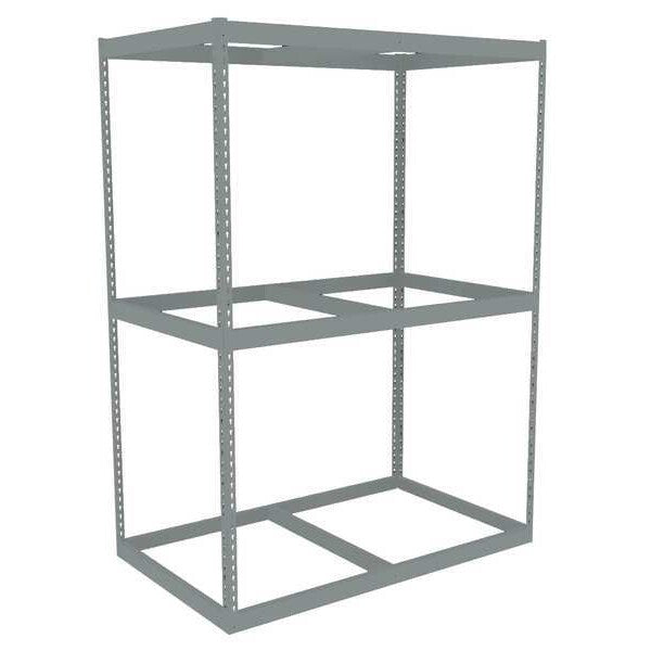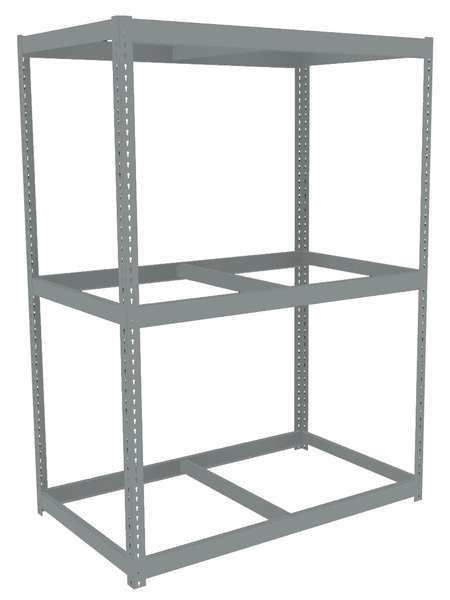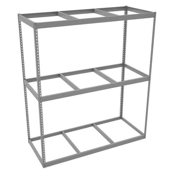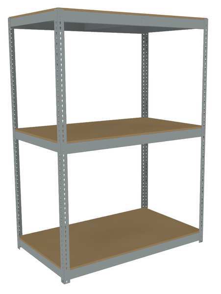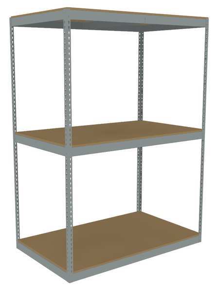 Description Boltless Shelving, Angle, Overall Depth 30 in, Overall Height 84 in, Overall Width 72 in, Shelf Gauge 14 ga, Shelf Adjustment Increments 1 1/2 in, Steel, Particleboard, Steel, (12) Beams, (4) Posts, Includes Decking Yes, 1,750 lb, Whole Unit Load Capacity 5,250 lb, Starter, Open, Post Gauge 14 ga, Number of Shelves 3, Maximum Post Load Capacity 8,000 lb with Beams Evenly Spaced at 24 in, Powder Coated, Heavy-Duty, Gray