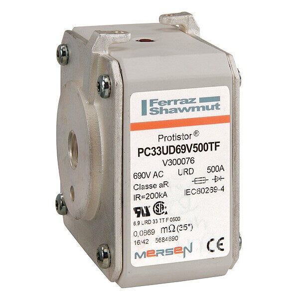 $665.56 / eachWeb priceSemiconductor Fuse, 500 A, Not RatedSKU G3228690CategoriesDescription Semiconductor Fuse, 500 A, 690V AC, Not Rated, PC33 Series, Indicating, Fast Acting, Body Style Square, Nonrejection, Interrupt Rating 200kA at 690V AC, Fuse Size 1-31/32 in L x 1-15/16 in W x 2-15/16 in D, Length 1 31/32 in, Width 1-15/16 in, Depth 2-15/16 in, Diameter Not Applicable, Equivalent Brand and Series Bussmann 170M, Littelfuse PSR, Mersen PC, Equivalent Series 170M, PC, PSR, Body Material Ceramic, Single ElementgraingerSKU: , mscSKU: , zoro_no: G3228690, mongo_id: 65bbe6b93aaddbd5a904b6aa